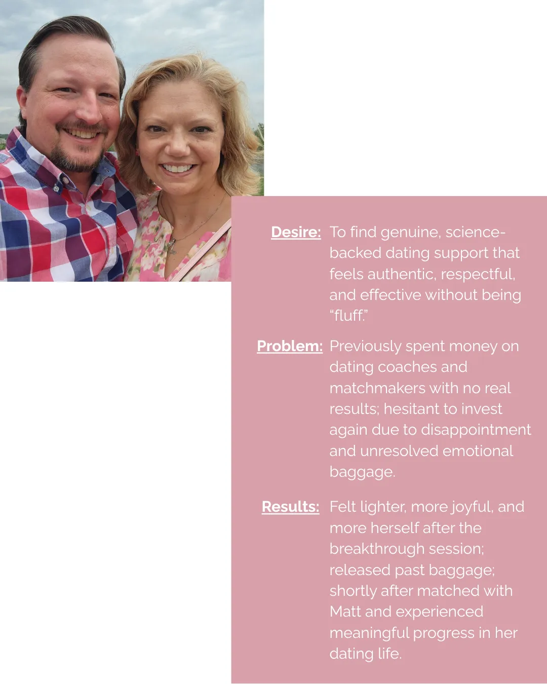 “I’ve worked with dating coaches before and matchmakers, and I was pretty hesitant to do that again to spend the money and see no results. But the fact that you have so many free things and introductions to what the work that you do was really helpful for me. Listening to what you had to say really seemed like sound advice. It was not a bunch of fluff; it’s based on science and studies and on real results, and that gave a lot of comfort to me.