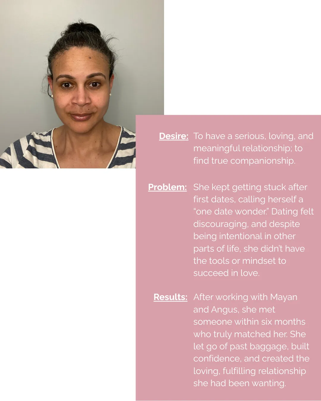 "I felt the thing that was missing in my life was probably having a serious relationship. I had tried to do it on my own for a long time and hadn’t gotten very far. I wasn’t what I would call a successful dater — I self-described as the ‘one date wonder.’ I could get to the first date, but it never went anywhere. I got discouraged and stopped trying, but years were going by and I still wanted companionship. I didn’t feel like I had the tools to get there, and for someone who is usually very intentional and committed in other parts of life, it made sense to reach out for professional help. That’s when I decided to invest in myself and work with Mayan and Angus.